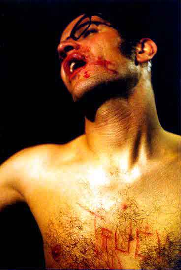 "I think I already told you about the show; Hector carved "fuck" into his chest & we all got really drunk on stage, both Hector & Greg cut their faces with broken bottles, blah blah blah. Anyway, at the end some guy came up on stage during the last song & tackled all of us, smashing Hector's cheek into this plastic tub we carry our cables in" - Jason (summer 2000)